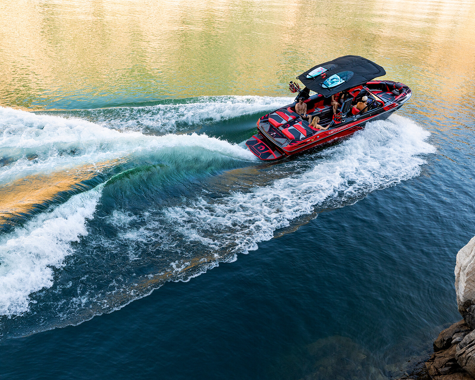 Sometimes function follows form. That’s the case of our incredibly fuel efficient Opt-V hull. Optimized with triangles built into the rear corners of the hull that stretch forward towards the bow, the Opti-V Hull creates lift and balance when underway reducing resistance and increasing fuel efficiency – more than 50% better than any other sports boat out there.