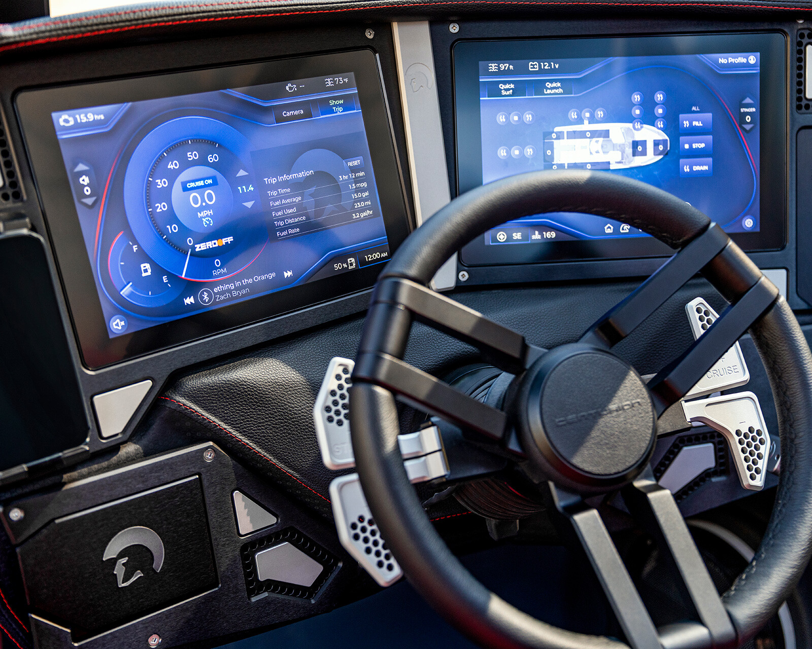 Fuel efficiency translates directly into more time on the water and less expense for you. The hull design eliminates drag and creates a level running attitude for less resistance, so the engine simply doesn’t work as hard to push a Centurion through the water, whether it’s weighted to ride or not. You can monitor this amazing fuel efficiency on the Captive SXS HD Touch Vision Dash thanks to the Range of View (ROV) system that displays realtime fuel usage data. We love offering that advantage to you.