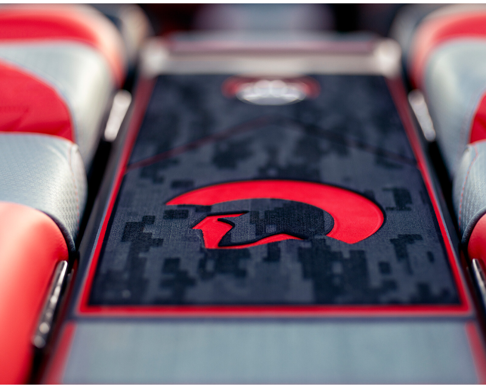 Gel Coat Scheme: Drive | Hull Main Front: Black Metal Flake | Hull Accent: Too Red | Hull Base: Charcoal | Swim Step: Too Red | Tower: Predator Power Tower | Tower Color: Black | PPT Top Color: Too Red | Tower Accent: Black Metal Flake | Colored Aluminum Accents: Too Red | Upholstery Scheme: Hex Accent with Cool Touch | Upholstery Main: Onyx Black | Upholstery Base: Too Red | Upholstery Accent: Onyx Black | Upholstery Accent 2: Charcoal | Upholstery Welt: Charcoal | Stitching Scheme: Ri Style Stitching | Stitching Accent: Red | Dash Accent: Onyx Black | Interior Side Panel: Black Metal Flake | Gator Step Flooring Scheme: 3-Color Warrior Cut w/ Laser | 1st Color Top: GS Black | 2nd Color Middle: GS Cardinal | 3rd Color Bottom: GS Shark Fin | Gator Step Laser Texture: Gator Step Laser Camo | Stereo: Centurion 12 Warriors Quad System by Wet Sounds | Speaker Color: Black