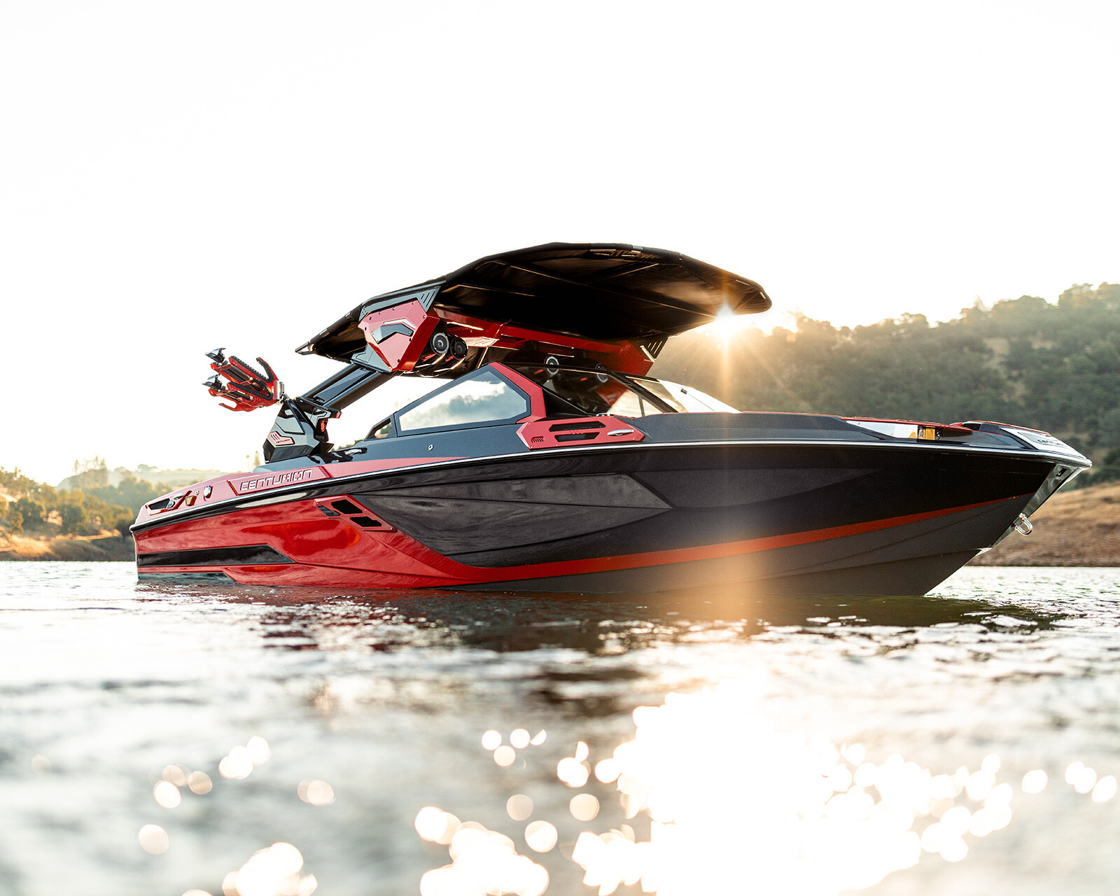 Four heavy-duty Linak actuators, each rated at 2,200 pounds, move in sync to ensure smooth motion and solid stability. Integrated hangers keep wet towels, vests, and ropes off the seats, while downlighting adds extra visibility after dark. For 2026, we’ve added an HD digital camera seamlessly built into the tower, giving the driver a clear view of the action behind the boat in real time. With a convertible bimini that zips open for extra sun, BombShell 2.0 board racks, and optional high-performance audio, this predator doesn’t just look mean—it eats the competition for lunch.
