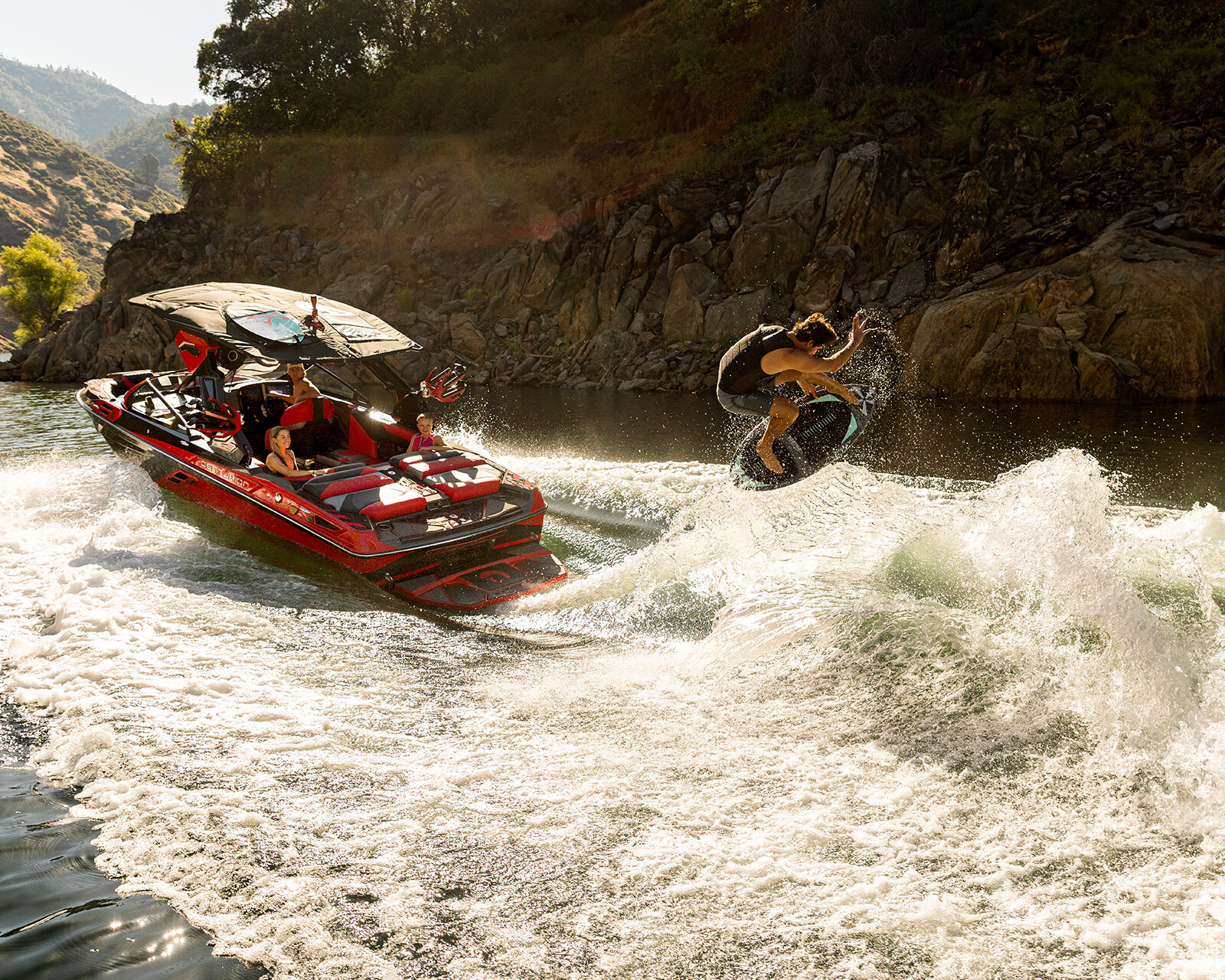 At each corner of the transom a flat triangle extends towards bow creating lift along the rear half of the boat for a level running attitude, front to back as well as side to side. Due to this balanced design, the Opti-V Hull enhances fuel economy and provides a much quieter ride than most boats delivering this type of power. With hook built into the rear edge of delta pad, the seated driver can see over the bow while pulling a rider without compromising the waves or wakes thanks to a level running attitude. The hull also deflects rollers, at the bow and transom, so big water can’t spoil your fun. It’s clear the Opti-V Hull delivers the best waves, wakes and ride - in all conditions.