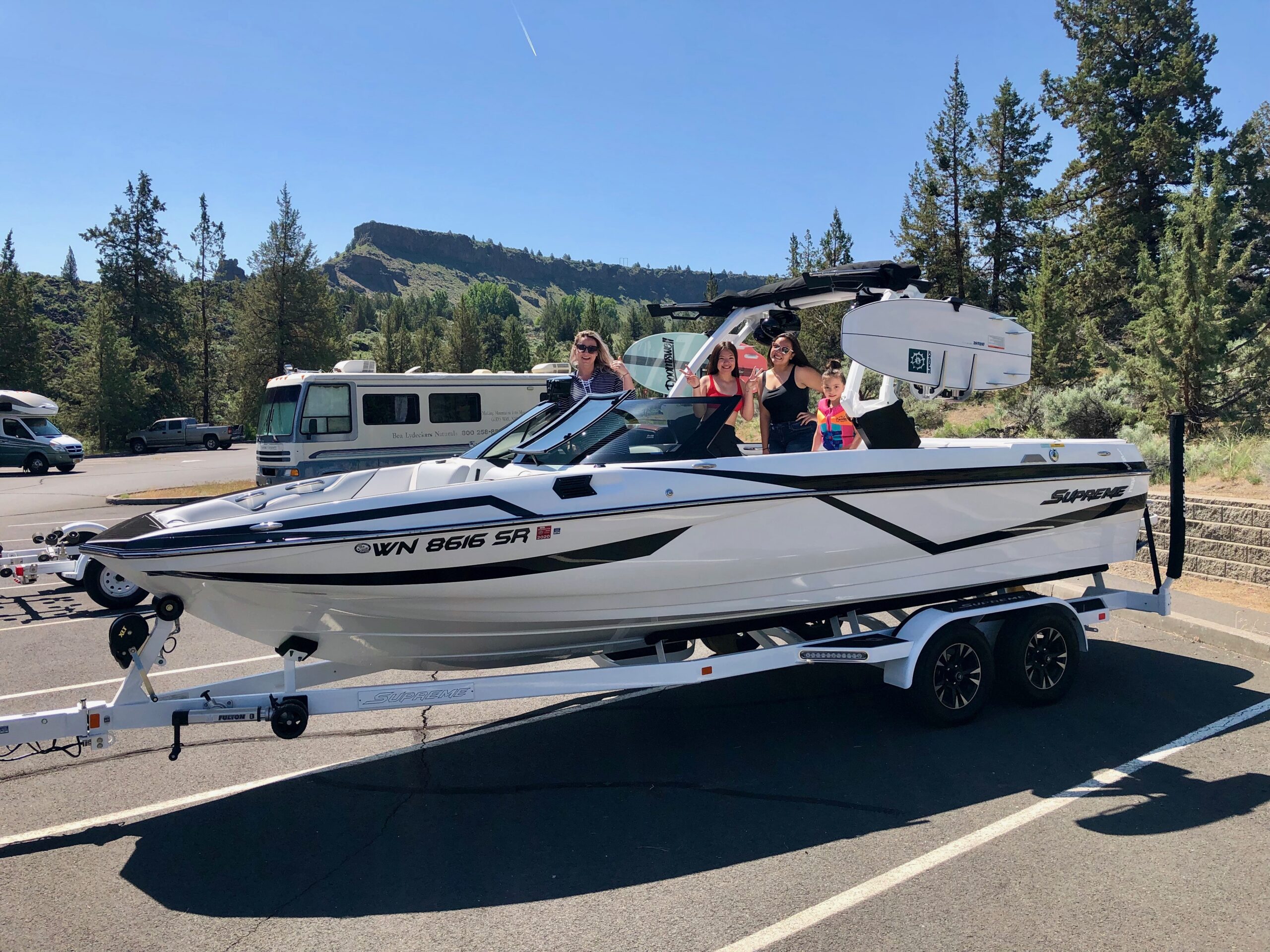The S238 quickly became the centerpiece of their summers. From big annual trips to Shasta and Coeur d’Alene to long days spent surfing, eating, and heading back out until sunset, the boat became a place where memories were made. Thinh’s oldest child learned to surf behind their Supreme, while their youngest found the confidence to ride just last year.