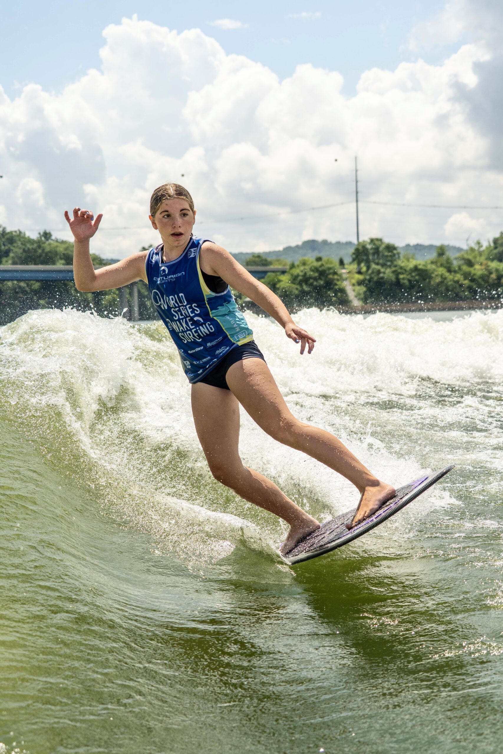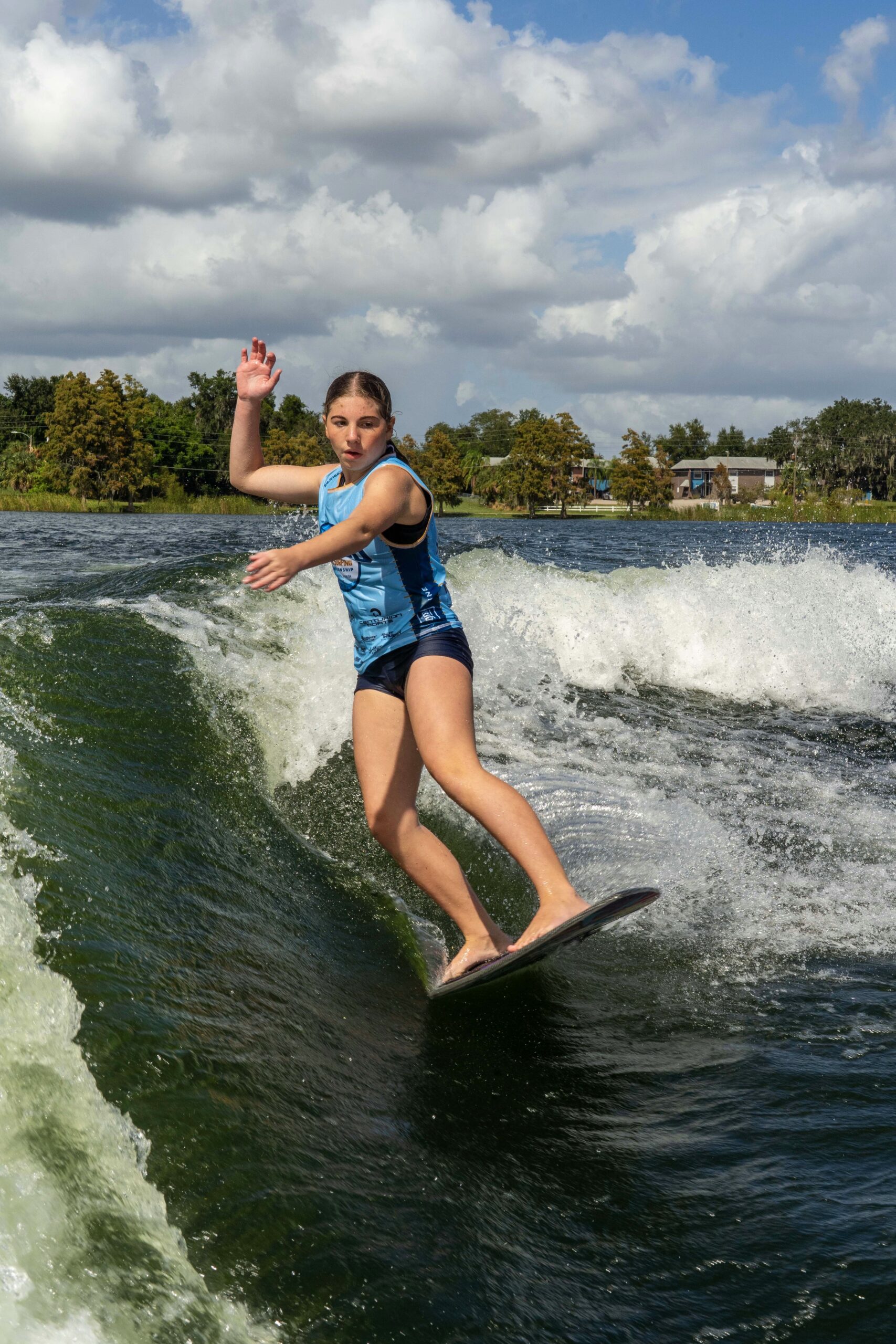 Aria Hellemn is a semi-pro wake surfer on Blue Lake, a small lake in Churubusco, Indiana. Aria has grown up around the lake, knee boarding and wakeboarding since the age of 4. She started surfing when she was only 5. Aria became more and more interested in learning new tricks and began surfing competitively in 2022. In 2023, she finished 3rd at the WSWS World Wake Surfing Championship in the Youth division. In 2024, she finished 2nd at the WSWS World Wake Surfing Championship in the Amateur Women Skim division. In 2025, she finished 1st at the WSWS World Wake Surfing Championship and was crowned the World Champion in the Amateur Women Skim division. Before competition, she listens to music and stretches to help her stay focused and calm before surfing. Don’t be surprised if you find Aria chewing gum while wake surfing, as it helps calm her nerves. In the offseason, Aria runs in middle school track. When Aria isn’t on the water, she like to draw, skateboard and watch Netflix.